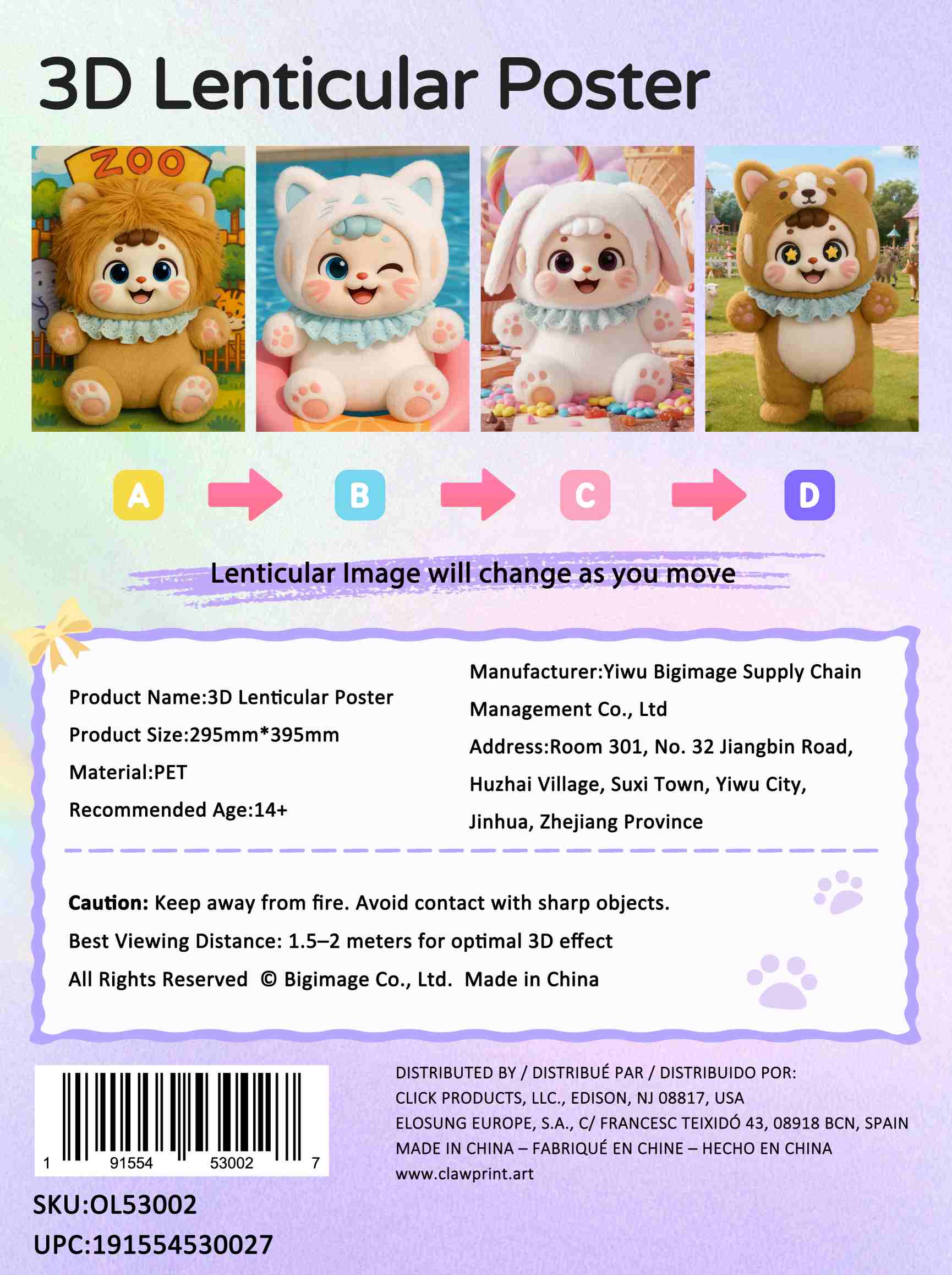 Experience the magic of dynamic visuals with our 3D Lenticular Poster! As you move, the image seamlessly transitions through multiple stages (A → B → C → D), creating an engaging and immersive optical effect.